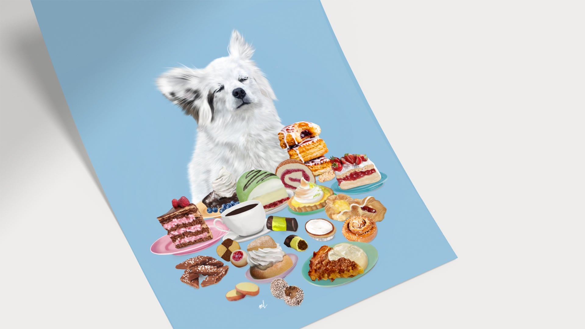 Ett digitalt motiv med ditt husdjur framför ett uppdukat fikabord. Perfekt att ge bort som present till en vän. Du väljer färg, text och roliga detaljer. Priset startar från 1500kr
